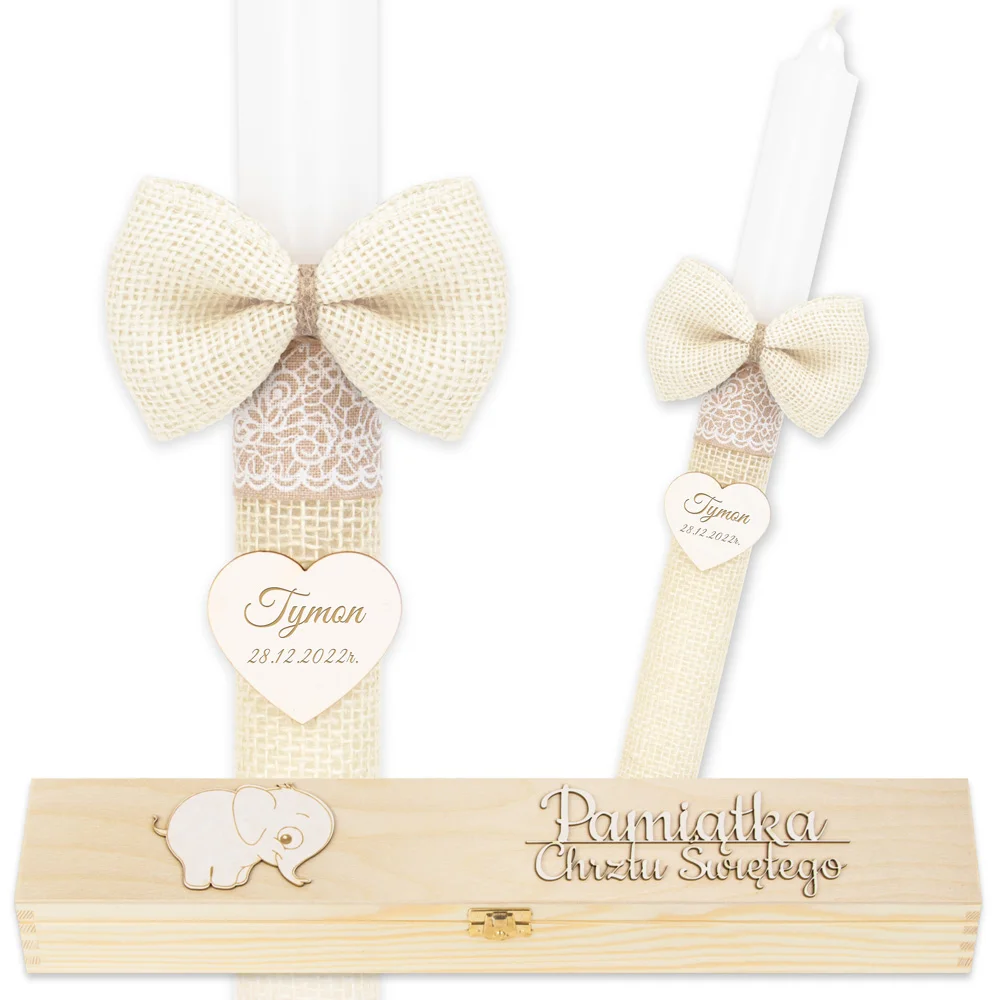 Uzupełnieniem świecy jest solidna, drewniana skrzyneczka, która pełni rolę zarówno eleganckiego opakowania, jak i bezpiecznego miejsca do przechowywania pamiątki przez dziesięciolecia. Wieczko pudełka przyciąga wzrok wypukłymi zdobieniami 3D: po lewej stronie znajduje się uroczy, drewniany słonik, a po prawej starannie wycięty napis "Pamiątka Chrztu Świętego".