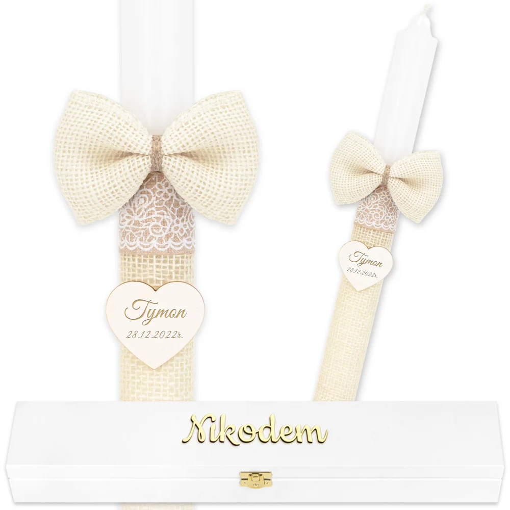 Centralny punkt stanowi drewniane serce, na którym z najwyższą dokładnością grawerujemy imię dziecka oraz datę sakramentu. Ten unikalny detal sprawia, że personalizowana świeca na chrzest z pudełkiem przestaje być tylko przedmiotem, a staje się osobistym świadectwem pierwszego sakramentu, wykonanym specjalnie na Twoje zamówienie.
