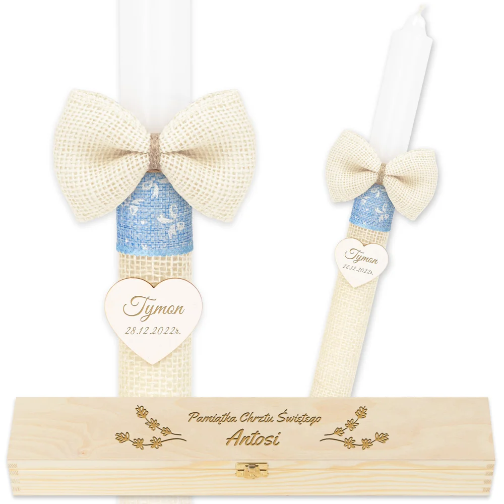 Ręcznie zdobiona Świeca do Chrztu Świętego wraz z pudełkiem.