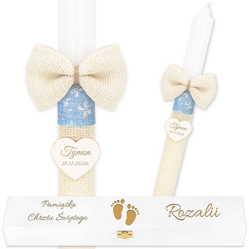 Ręcznie zdobiona Świeca do Chrztu Świętego wraz z pudełkiem.