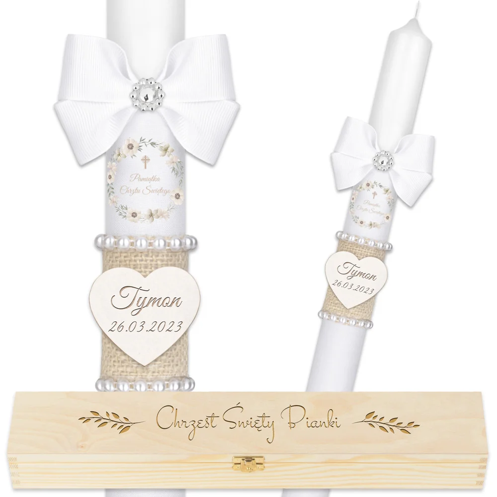 Ręcznie zdobiona Świeca do Chrztu Świętego wraz z pudełkiem.