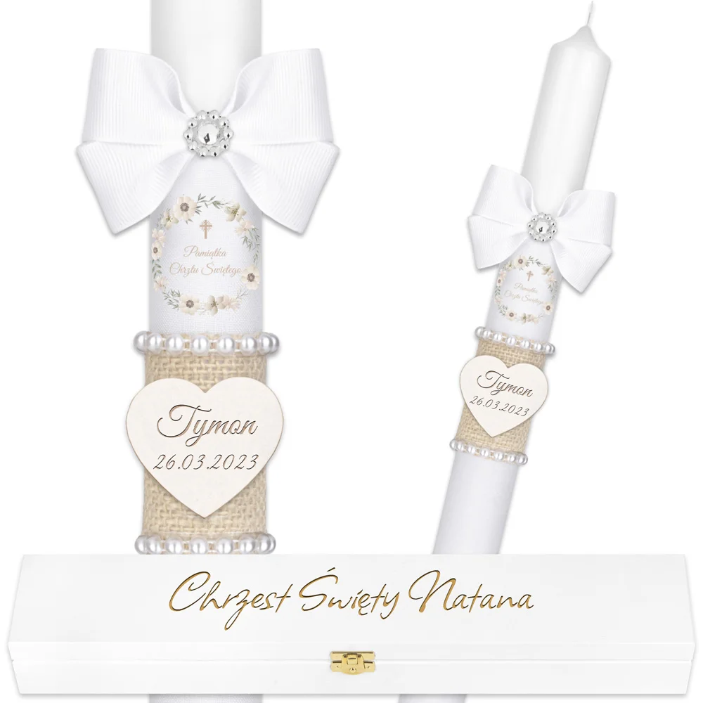 Ręcznie zdobiona Świeca do Chrztu Świętego wraz z pudełkiem.