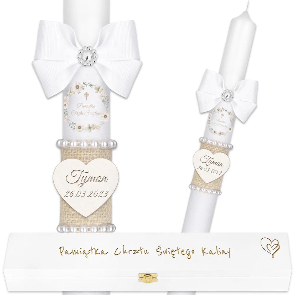 Ręcznie zdobiona Świeca do Chrztu Świętego wraz z pudełkiem.