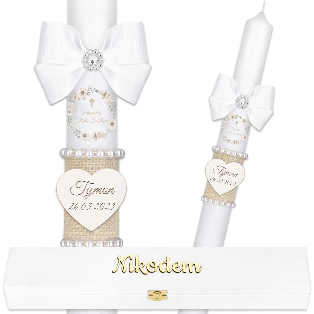 Ręcznie zdobiona Świeca do Chrztu Świętego wraz z pudełkiem.
