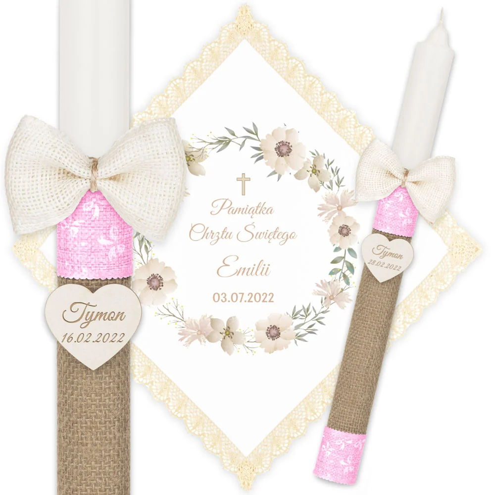 Ręcznie zdobiony zestaw Świeca oraz szatka do Chrztu Świętego.