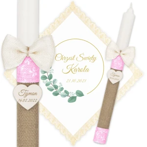 Ręcznie zdobiony zestaw Świeca oraz szatka do Chrztu Świętego.