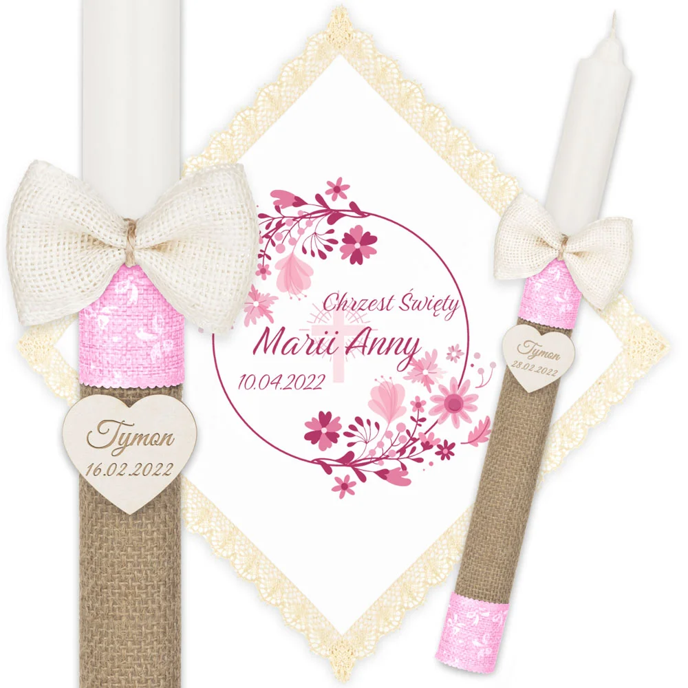 Ręcznie zdobiony zestaw Świeca oraz szatka do Chrztu Świętego.