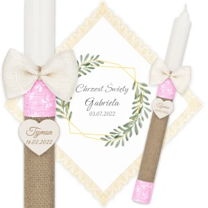 Ręcznie zdobiony zestaw Świeca oraz szatka do Chrztu Świętego.