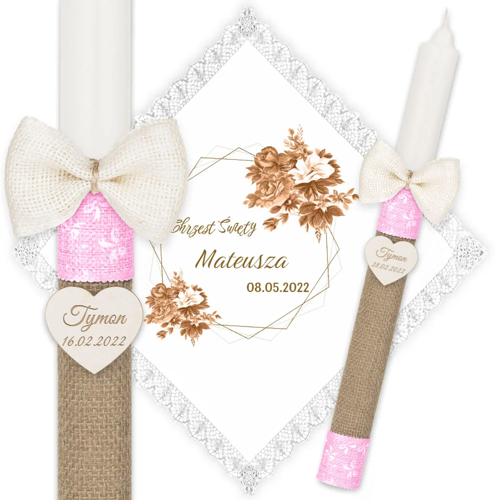 Ręcznie zdobiony zestaw Świeca oraz szatka do Chrztu Świętego.