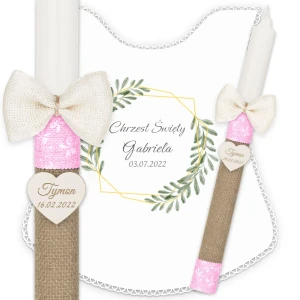 Ręcznie zdobiony zestaw Świeca oraz szatka do Chrztu Świętego.