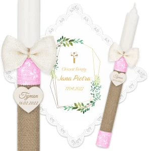 Ręcznie zdobiony zestaw Świeca oraz szatka do Chrztu Świętego.