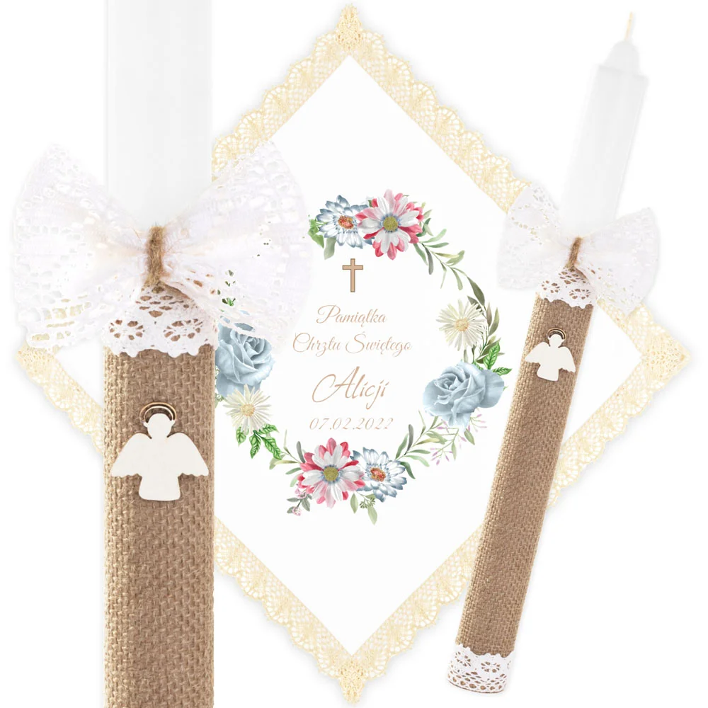 Ręcznie zdobiony zestaw Świeca oraz szatka do Chrztu Świętego.