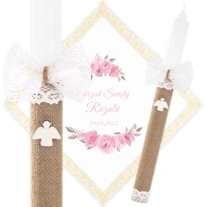 Ręcznie zdobiony zestaw Świeca oraz szatka do Chrztu Świętego.