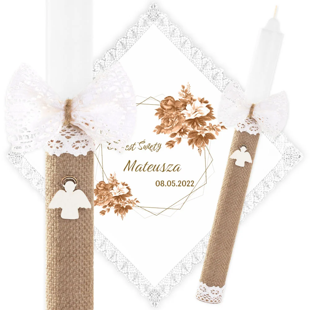 Ręcznie zdobiony zestaw Świeca oraz szatka do Chrztu Świętego.