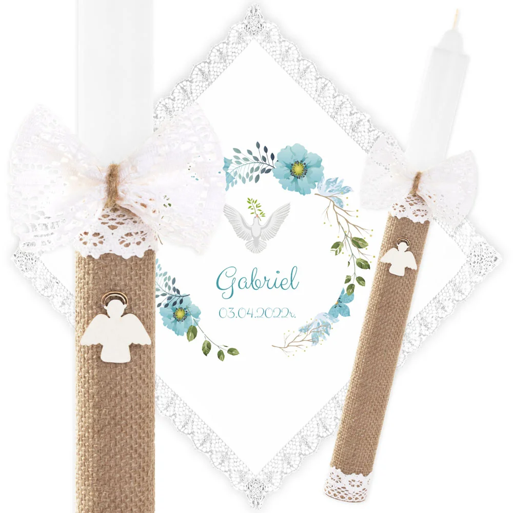 Ręcznie zdobiony zestaw Świeca oraz szatka do Chrztu Świętego.