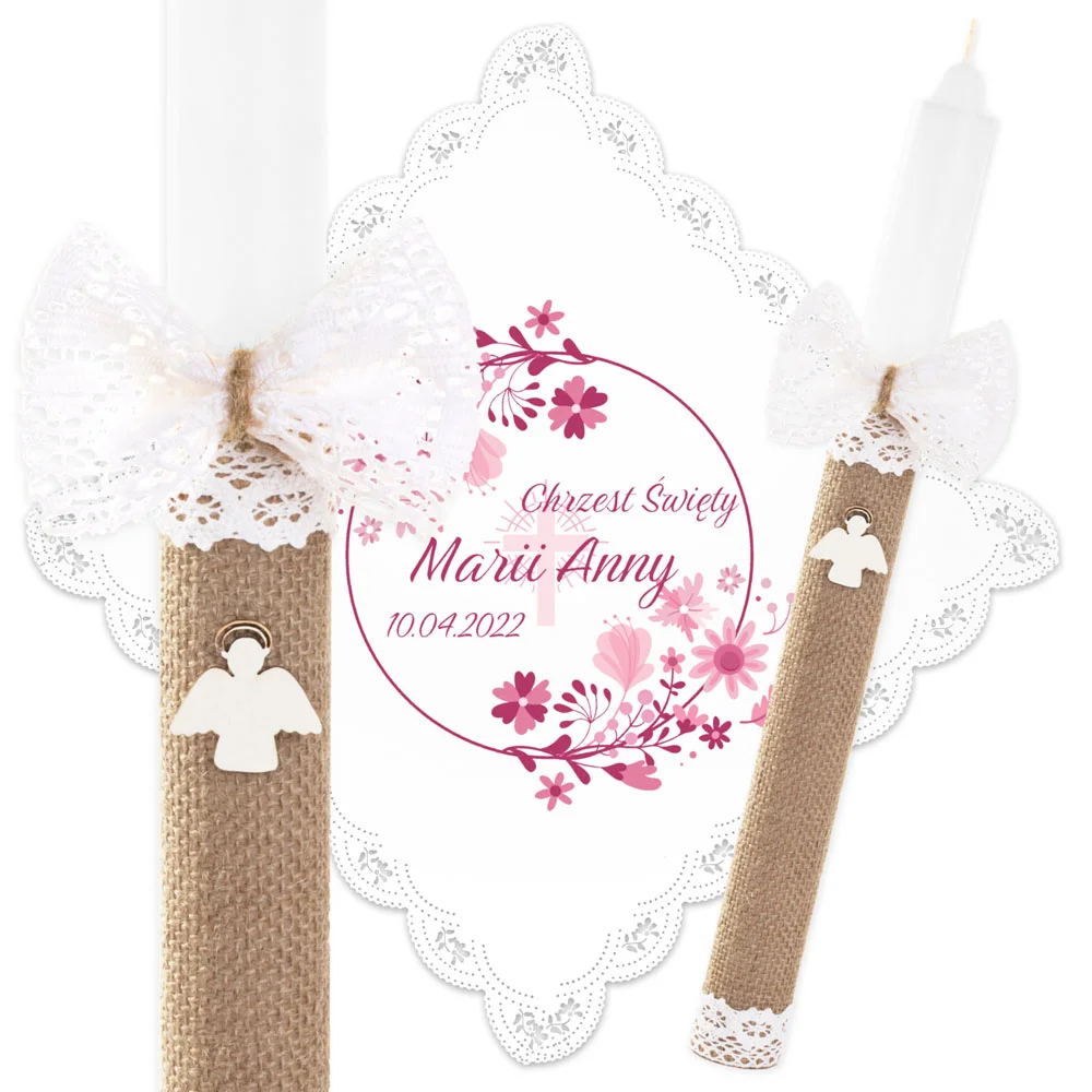 Ręcznie zdobiony zestaw Świeca oraz szatka do Chrztu Świętego.