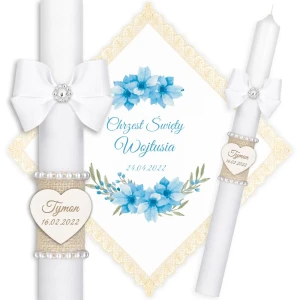 Ręcznie zdobiony zestaw Świeca oraz szatka do Chrztu Świętego.