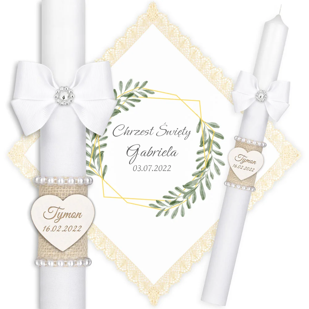 Ręcznie zdobiony zestaw Świeca oraz szatka do Chrztu Świętego.
