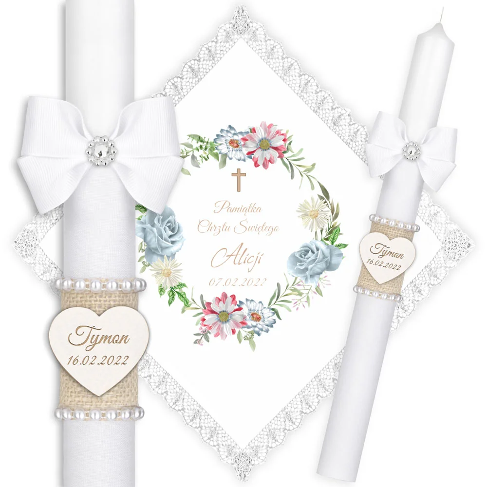 Ręcznie zdobiony zestaw Świeca oraz szatka do Chrztu Świętego.