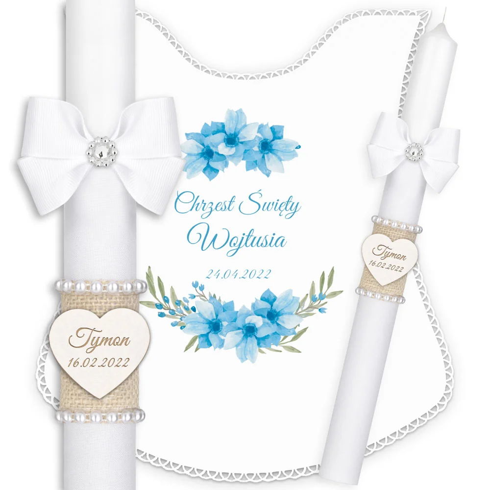 Ręcznie zdobiony zestaw Świeca oraz szatka do Chrztu Świętego.