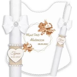 Ręcznie zdobiony zestaw Świeca oraz szatka do Chrztu Świętego.