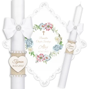 Ręcznie zdobiony zestaw Świeca oraz szatka do Chrztu Świętego.