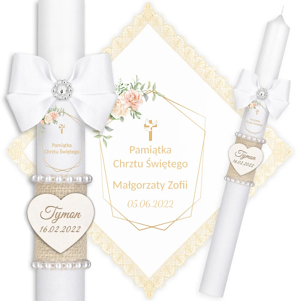 Ręcznie zdobiony zestaw Świeca oraz szatka do Chrztu Świętego.