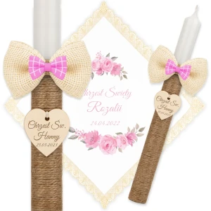 Ręcznie zdobiony zestaw Świeca oraz szatka do Chrztu Świętego.
