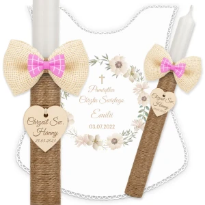 Ręcznie zdobiony zestaw Świeca oraz szatka do Chrztu Świętego.