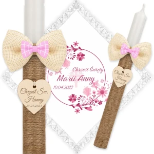Ręcznie zdobiony zestaw Świeca oraz szatka do Chrztu Świętego.