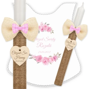 Ręcznie zdobiony zestaw Świeca oraz szatka do Chrztu Świętego.