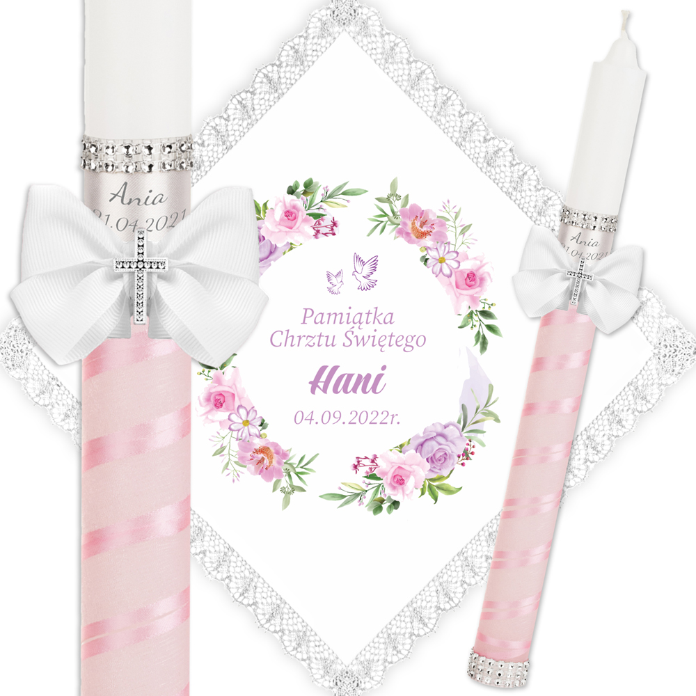 Ręcznie zdobiony zestaw Świeca oraz szatka do Chrztu Świętego.