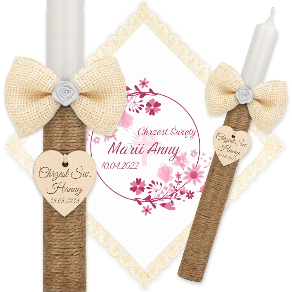 Ręcznie zdobiony zestaw Świeca oraz szatka do Chrztu Świętego.