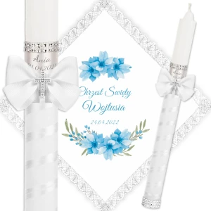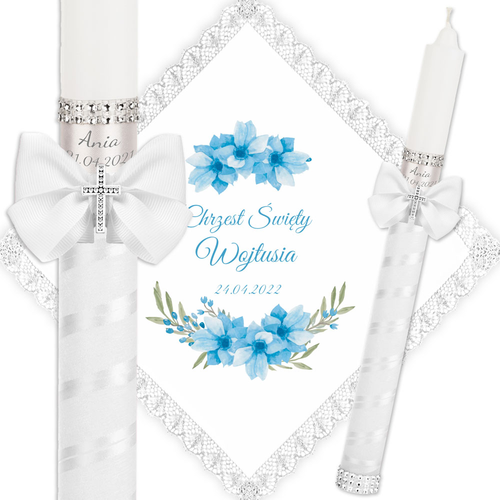 Ręcznie zdobiony zestaw Świeca oraz szatka do Chrztu Świętego.