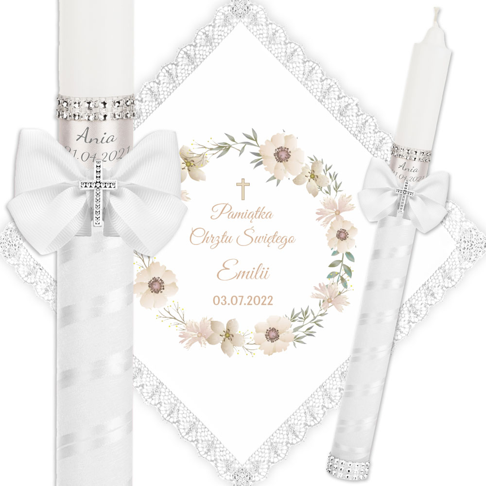 Ręcznie zdobiony zestaw Świeca oraz szatka do Chrztu Świętego.