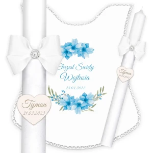Ręcznie zdobiony zestaw Świeca oraz szatka do Chrztu Świętego.