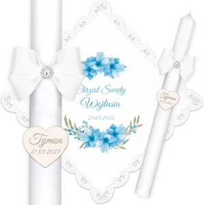 Ręcznie zdobiony zestaw Świeca oraz szatka do Chrztu Świętego.
