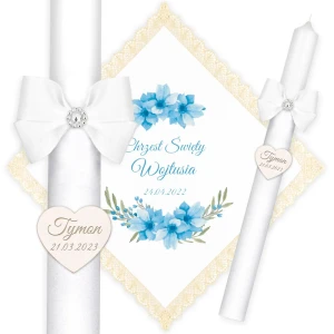 Ręcznie zdobiony zestaw Świeca oraz szatka do Chrztu Świętego.