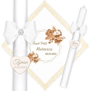 Ręcznie zdobiony zestaw Świeca oraz szatka do Chrztu Świętego.