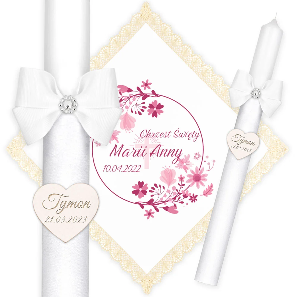Ręcznie zdobiony zestaw Świeca oraz szatka do Chrztu Świętego.