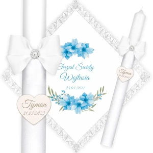 Ręcznie zdobiony zestaw Świeca oraz szatka do Chrztu Świętego.