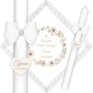 Ręcznie zdobiony zestaw Świeca oraz szatka do Chrztu Świętego.