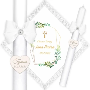 Ręcznie zdobiony zestaw Świeca oraz szatka do Chrztu Świętego.