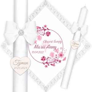 Ręcznie zdobiony zestaw Świeca oraz szatka do Chrztu Świętego.