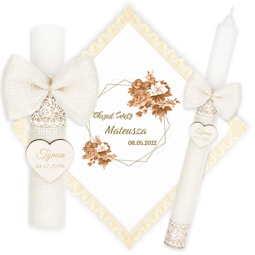 Ręcznie zdobiony zestaw Świeca oraz szatka do Chrztu Świętego.