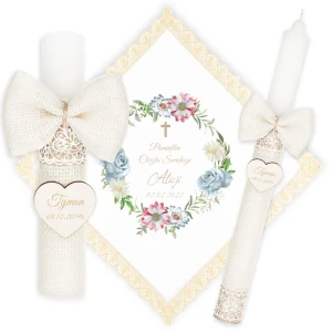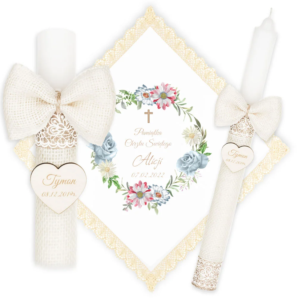 Ręcznie zdobiony zestaw Świeca oraz szatka do Chrztu Świętego.