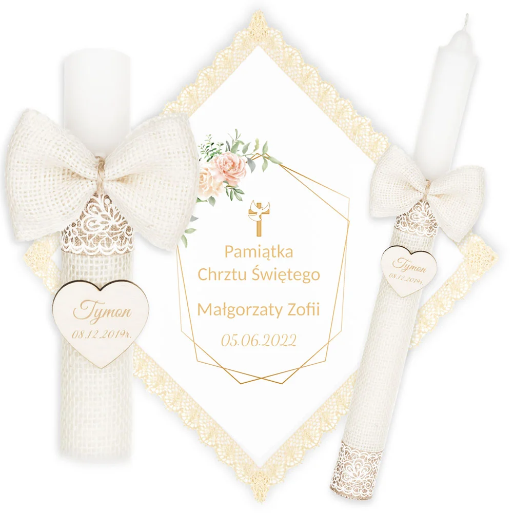 Ręcznie zdobiony zestaw Świeca oraz szatka do Chrztu Świętego.
