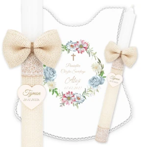 Ręcznie zdobiony zestaw Świeca oraz szatka do Chrztu Świętego.