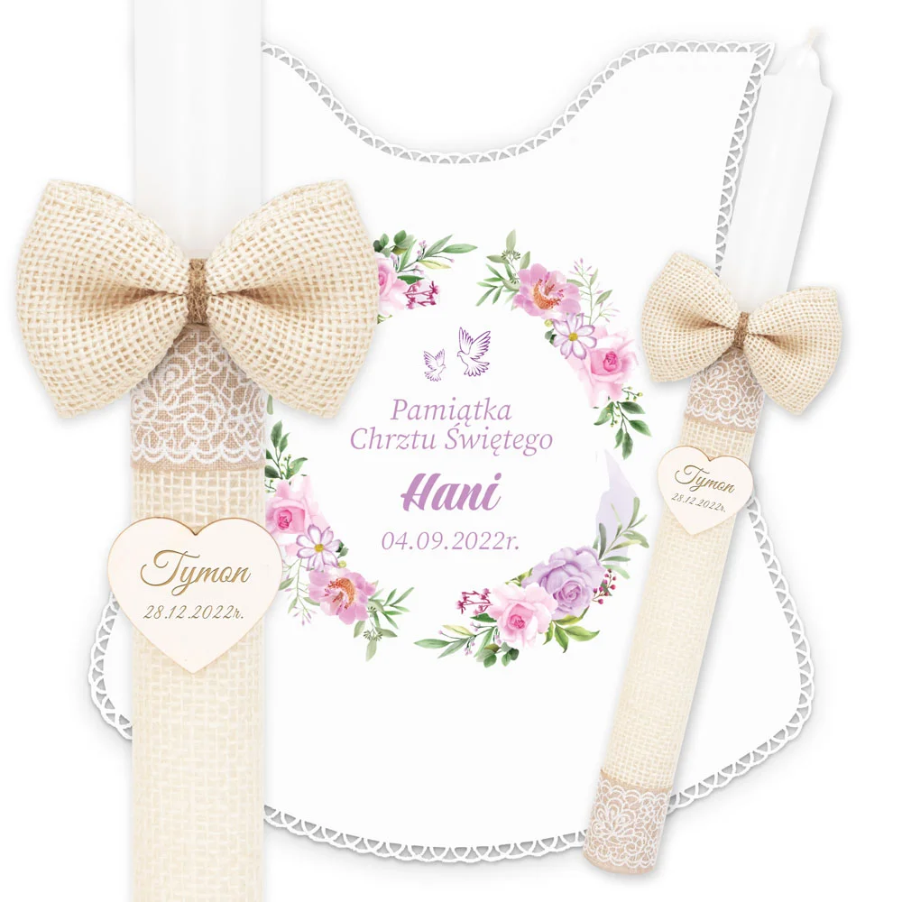 Ręcznie zdobiony zestaw Świeca oraz szatka do Chrztu Świętego.
