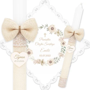 Ręcznie zdobiony zestaw Świeca oraz szatka do Chrztu Świętego.